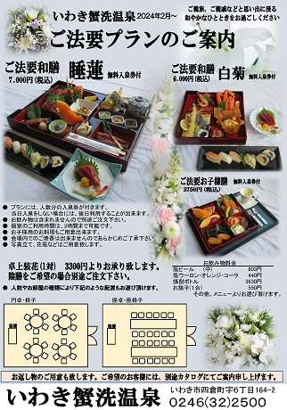 日帰りパックプラン、シルバーパックプラン、ご法要プラン等10名様より承ります。